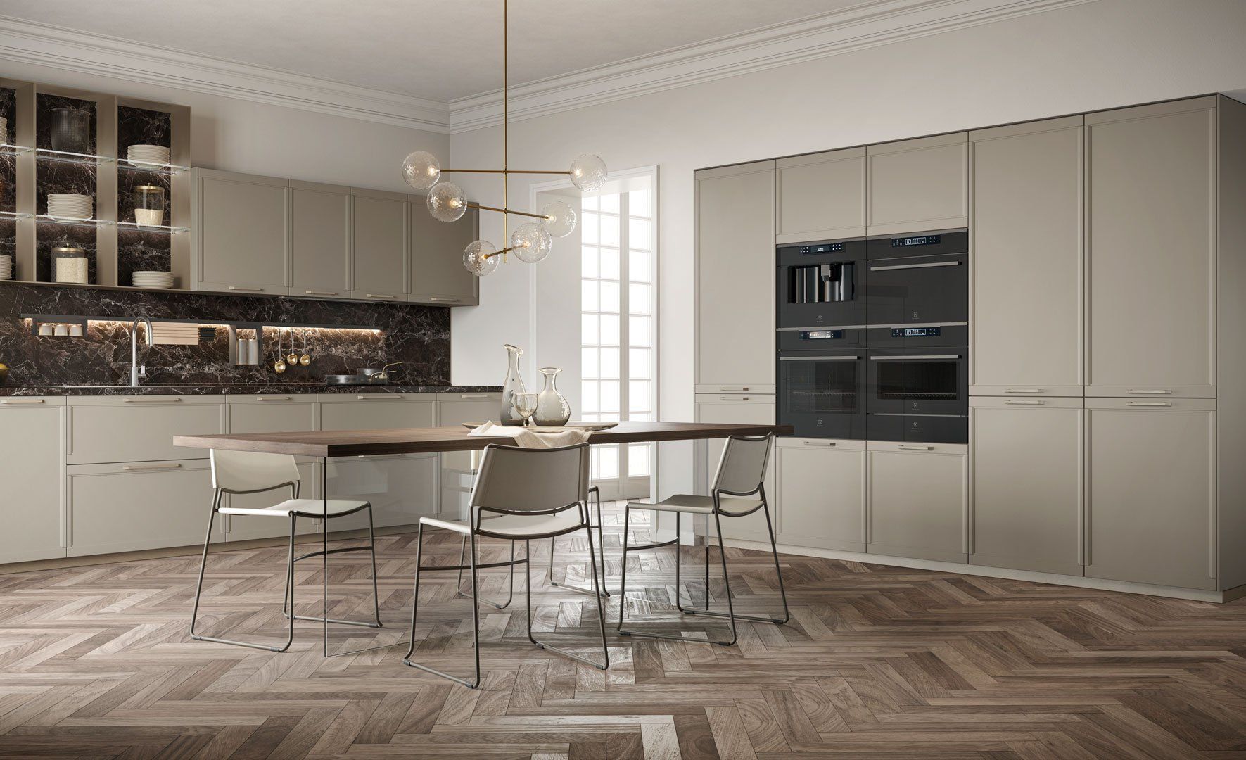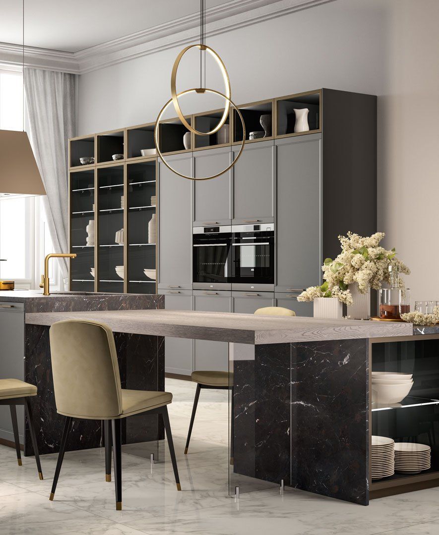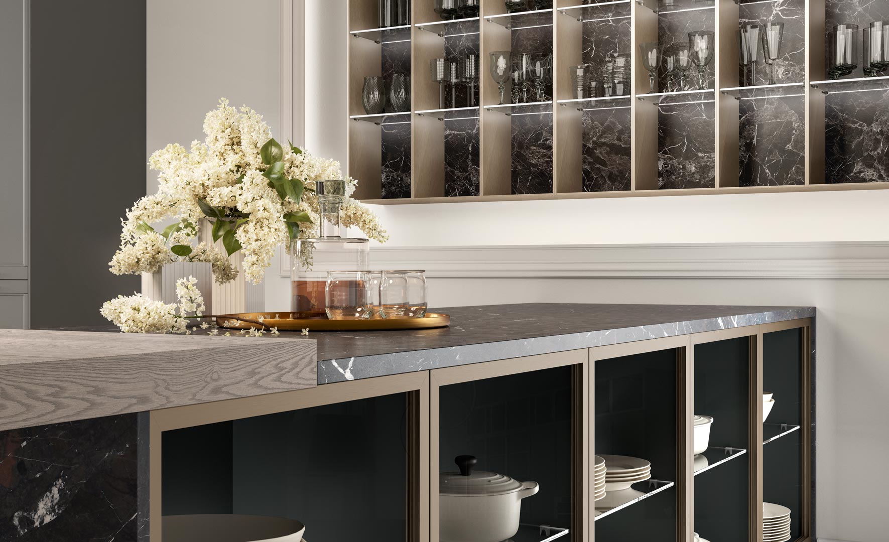 Flavour interpreta lo stile classico con finiture ricercate ed eleganti che creano un ambiente dalla bellezza senza tempo mentre lo spazio di lavoro risulta dinamico e raffinato come richiedono i ritmi di una vita moderna. I volumi rispecchiano i canoni classici ma le forme sono razionali; ogni cosa trova così la sua corretta collocazione. In questa composizione le maniglie in metallo, in perfetta sintonia con gli elementi a giorno in alluminio, creano preziosi dettagli stilistici che si integrano perfettamente con le raffinate gradazioni di grigio che danno carattere a questo modello.